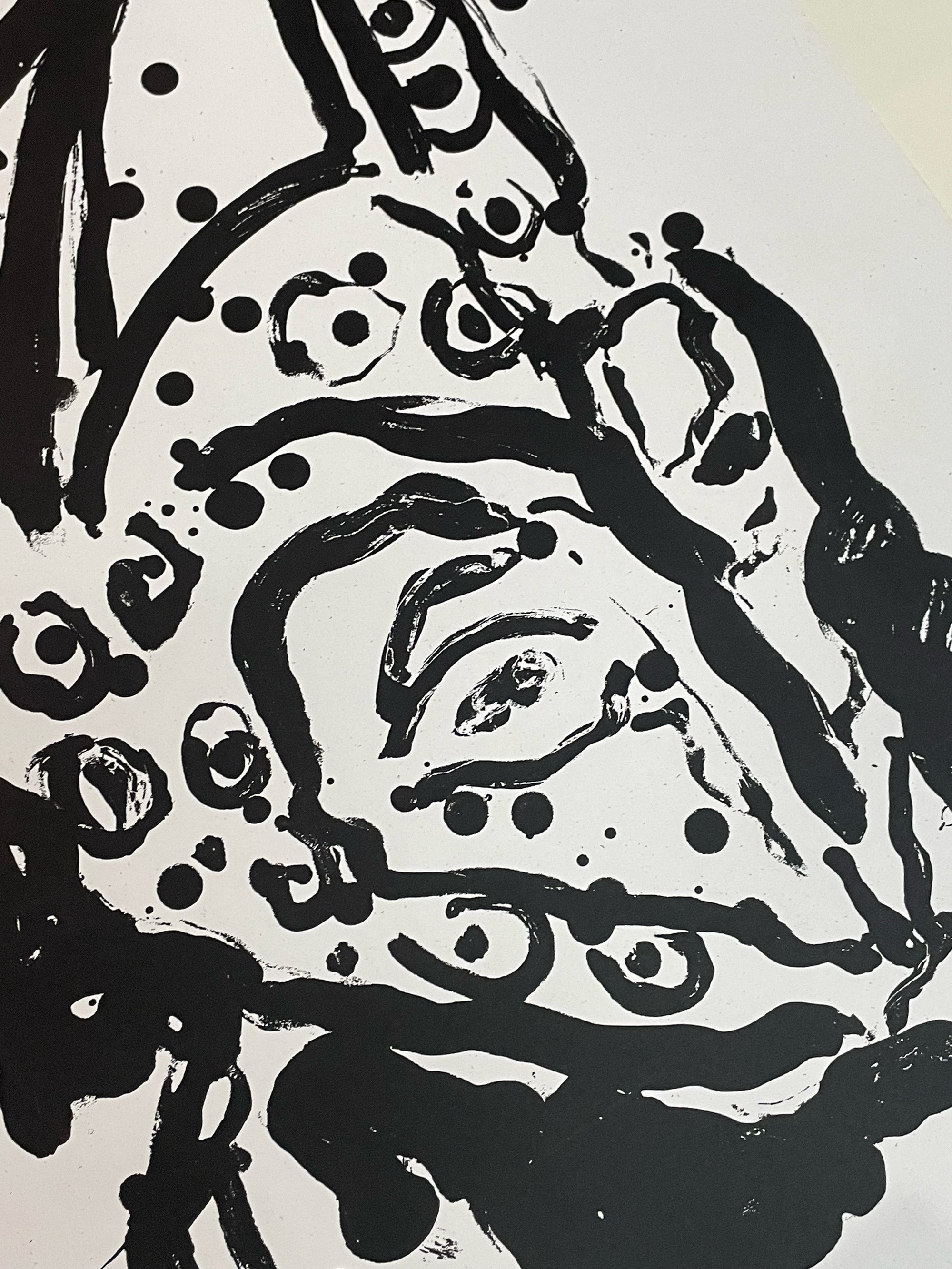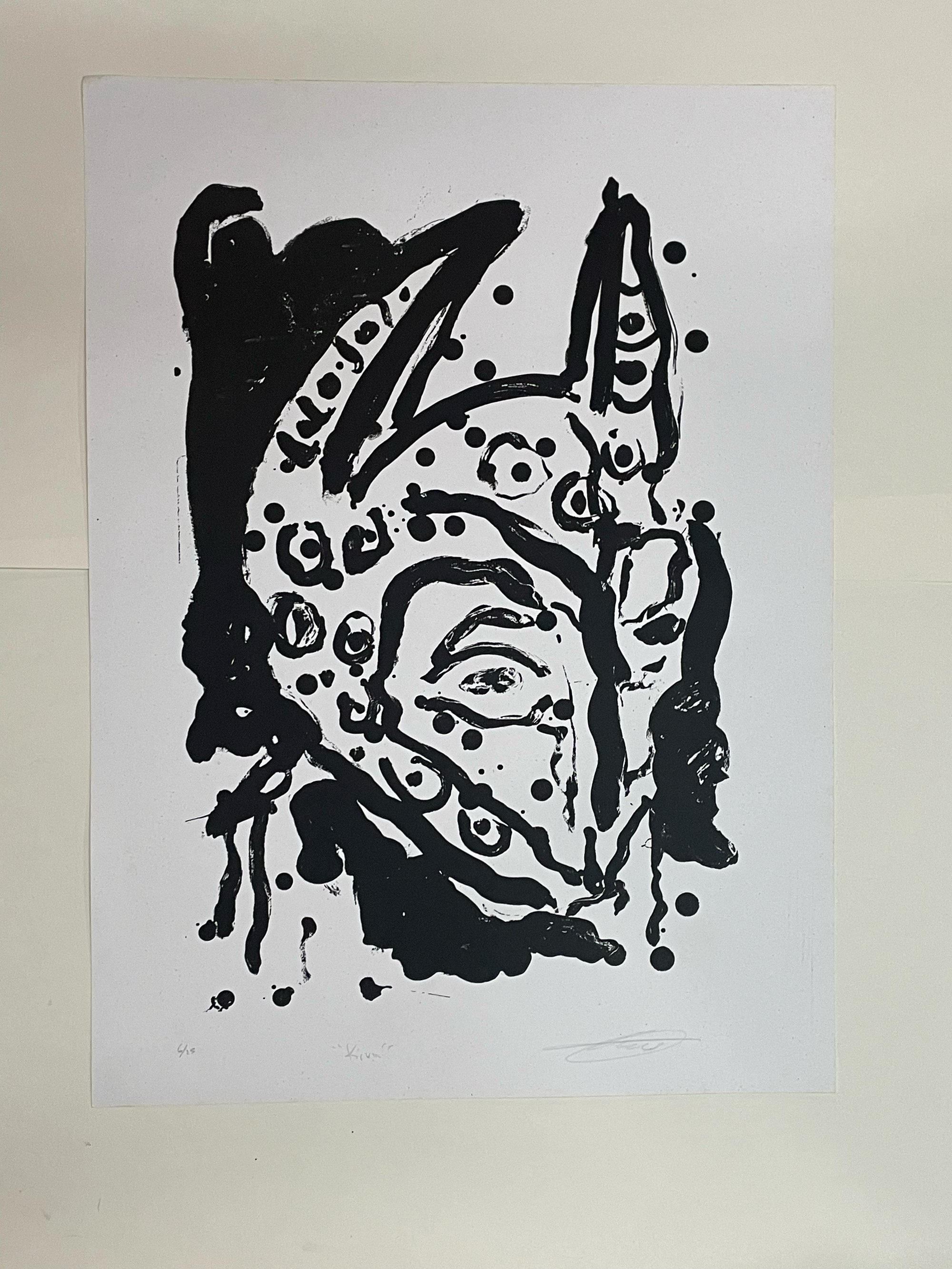La immpresión consiste en un dibujo en tinta china de una mascara realizada por el artista para su amigo Kivan. El dibujo de la mascara fue traducido a serigrafía e impreso.